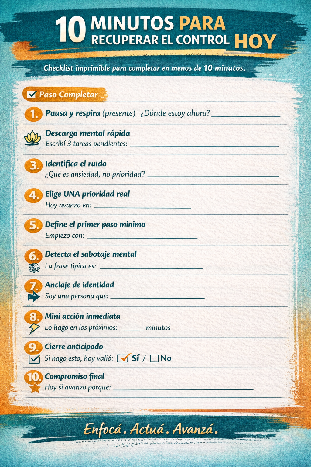 Esta checklist fue creada para esos días en los que tu mente está saturada, las tareas se acumulan y sientes que estás ocupado… pero no avanzando. En solo 10 minutos vas a poder bajar el ruido interno, ordenar tus prioridades y elegir una sola acción que haga que hoy valga la pena. No es productividad vacía. Es dirección emocional. Es volver a ti.